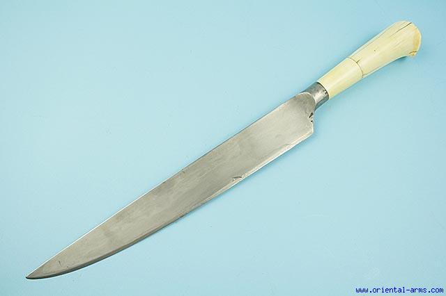This kard with its massive pattern welded blade is coming from North India, second half of the 19C. 13 inches blade length, 2 inches blade width. Two sectors massive ivory grip (One sector is probably a later addition). Total length 19 inches. Very good condition. |