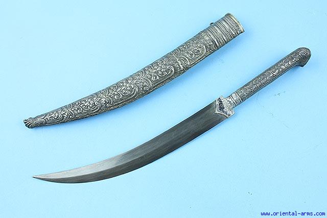 This rare dagger is Turkish, early 19C. . It is a very fine mix between the double edged curved Jambiya (or Khanjar) and the Bichaq knife. The fine blade is 9 inches long, constructed from a twisted steel core forge welded between high carbon steel edges. Similar construction is known from Yataghan swords from the period. Silver on pewter base handle with classical eared pommel. Silver scabbard. Total length 15 inches. Next to mint condition. Scarce and interesting item. |