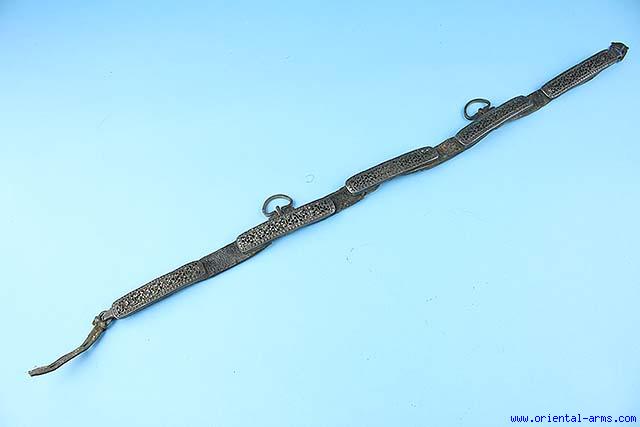 Although not really a weapon, belts are used by each man and woman in Tibet to carry a utility knife / Dagger, powder flasks, flint pockets and other accessories. This belt is of top quality workmanship and probably belonged to a high ranking person. It is composed of long leather belt mounted with 5 steel links richly pierced in a classical Tibetan style. Two steel hanging rings and a steel buckle. Total length 36 inches. Very good condition. Fine late 19C. artifact |