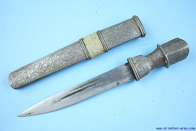 This knife is of Tibetan origin, early 20 C. Single edged blade 8 1/2 inches long. Wood handle with chased white metal pommel and grip bound with twisted wire. Finely engraved steel handle and scabbard mounts with a band of rye skin between the locket and the chape.. Total length 14 inches. Very good condition. Blade well used. |