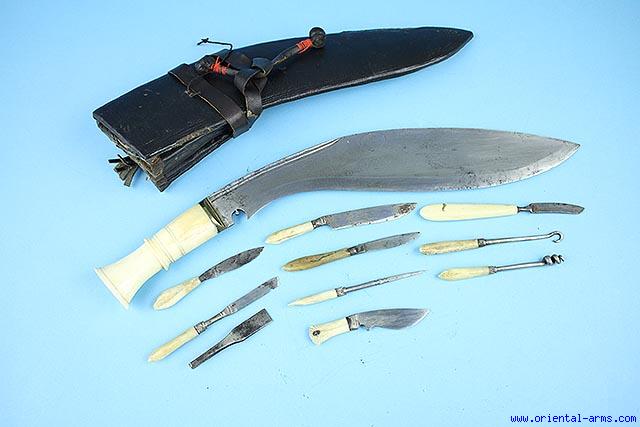 An interesting, early 20 C. khukuri Knife / Dagger from Nepal that comes with more than 10 accessories: Small knives screwdriver, chisel, tweezers and other small implements all with bone handles. These types of Khukuri were used by villages handymen to perform all kind of small repair jobs (some say medical treatment as well). Well made blade 12 inches long with ridged spine and brass bolster. Bone grip. Original leather scabbard with many pockets for all accessories. Very good condition. |