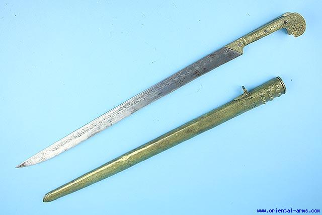 Probably of East European origin, second half of the 19C. Straight blade22 inches long nicely engraved. Solid brass grips and bolsters. Brass scabbard. Both the handles and the scabbard are finely engraved. Total length 27 1/2 inches. Very good condition. A well made complete Yataghan sword. |
