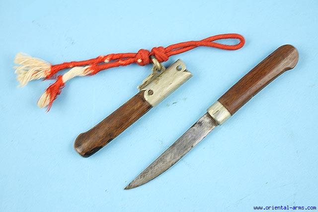 This rare small knife is Korean. also known as Eunjangdo . Although the direct translation of the name is "silver knife", it is quite common to call all these small knives Eunjangdo. Some times it is referred to as Women knife as it was used to be carried by Korean women for self protection. This authentic piece is late 19C - early 20C., 3inches blade, mounted in a wooden hilt and scabbard, with white metal fittings and original red cord. Total length 6 ½ inches. Very good condition Authentic and rare find. |