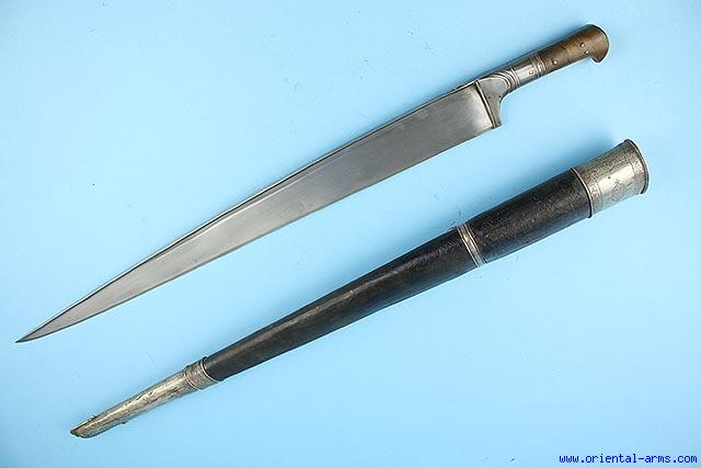 This is a classical very fine example of the famous Khyber sword coming from Afghanistan. The heavy massive blade is 23 inches long and more than 2 inches wide with a pronounced T spine. The bolsters and grips straps are steel, engraved with a signature in Arabic letters probably the owner name. The grips are horn with good age patina. Original scabbard with engraved silver locket and chape. Total length 28 inches. Very good plus condition. Like in the classical swords of this type, the blade goes all the way into the scabbard and only the pommel end of the handle is exposed. Very impressive authentic and complete sword. Late 19c. |