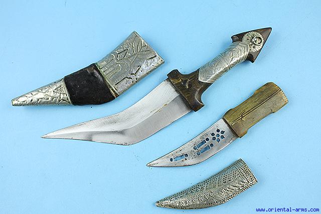 The smaller one with the nicely pierced blade is most probably coming from the southern parts of Israel, sometime referred to as coming from Gaza. 4 1/2 inches blade, pierced in a geometric pattern. Solid horn handle and white metal covered scabbard.