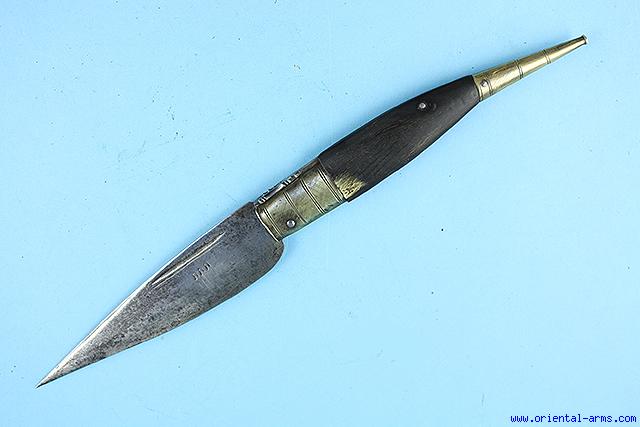 A Spanish folding knife known also as Navaja . It was extensively used in Spain during the 18 and 19 Centuries to cut food as well as to settle personal accounts, and found as a man best companion still today. This one is an early 19 Century exemplar, with signed 7 1/2 inches fullerd blade, horn grips and brass mounts. Total length fully opened is 18 1/2 inches. very good condition |