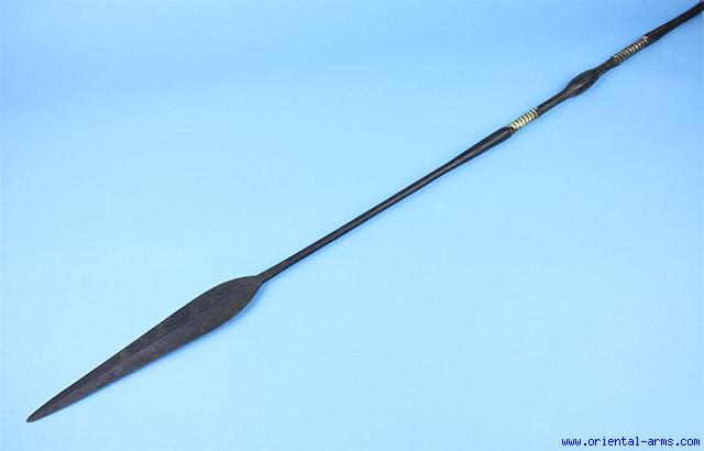 Long and heavy spear, with a leaf shaped15 inches blade on a 17 inches long socket. 20 inches steel tail. Central wood grip with two brass strips binding. Total length 64 inches. Origin not clear. Very good condition, Good dark age patina on the steel parts, but no rust or pitting. Tail piece slightly loose. Interesting spear.