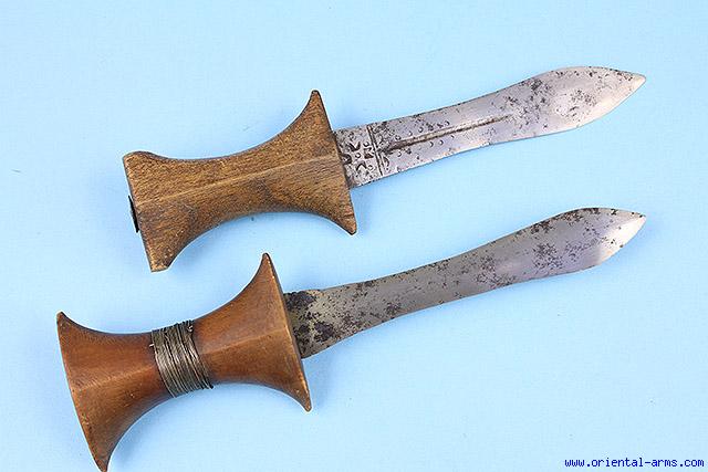 Probably from Sudan, early 19C. or earlier, leaf shaped blades, deadly sharp with wood handles. One of the blades is marked. Blades 6 inches. Total 9 inches. Good condition to age. Minor pitted spots. No scabbards.
