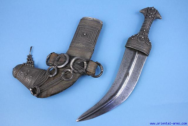 A fine quality Arab Jambiya dagger from Oman in the royal style known as Saidi . It has a well forged, 8 inches long, curved and dual edge blade with a central rib. The hilt is made of silver in the classical “I” shaped, decorated with many small silver filigree pieces. The scabbard is “L” shaped covered with fabric. The belt attachment is made of complicate arrangements of 7 silver rings and twisted silver wire. All scabbard and hilt fittings are silver chased in a typical design. Very good condition. A very impressive khanjar |