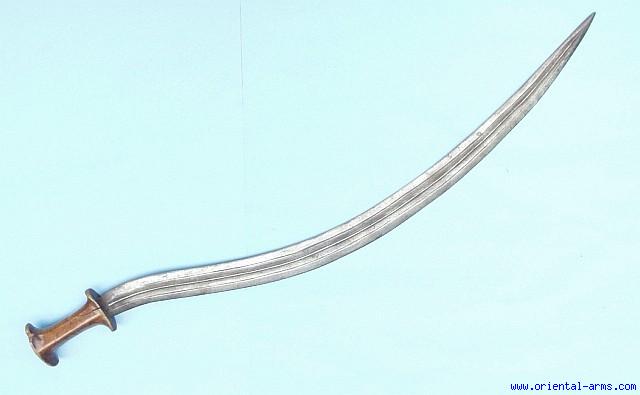 The Shotel is the traditional sword of the Abyssinian (Ethiopia). It looks like a huge sickle, with a long blade deeply curved almost to half circle. The purpose of this very awkward blade is to strike over or around the shield of an opponent. It is 30 Inches long, (point to point) with two fullers and a central rib on the entire length of the blade. The hilt is wood with an engraved brass cap on the pommel. Total length 35 inches. All parts are original and dated to the late 19th C. Good condition.. An age crack and chips chip to the wood grip. No scabbard. |