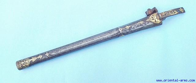 This interesting barrel from a Turkish percussion pistol (barrel only) is state of the art in pattern welded (Damascus) steel, in the pattern known as Twisted Stars. 12 inches barrel length, 14 inches total length, nicely decorated with gold koftgari decoration and Arabic inscription. Very good condition. |