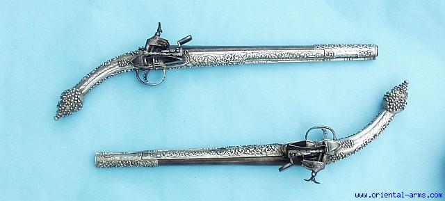This fantastic pair of pistols is coming from Greek or Albania, early 19 C. Identical 19 ½ inches long each with Miquelet lock and elaborate silver mounts in high relief. Excellent working condition. A very similar pair is shown in R. Elgood Firearms of the Islamic World Page 94. |