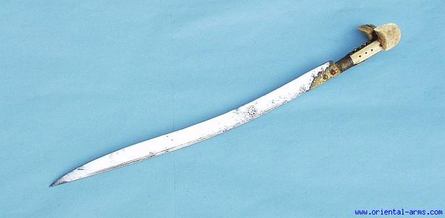 A nice example of a classical “YATAGAN” from the Balkan with a 24 inches long blade decorated with Arabic inscription in silver koftgari and dated to 1278 in the Islamic calendar corresponds to 1861 in the Gregorian calendar. The grips with the side ears are carved from walrus ivory. The grip strap and the blade collar fittings are made of gilded copper with filigree work set with Coral stones. Total length 30 inches. Good condition. There is a ˝ crack in the blade about 6 inches from the tip but hold very solid. No scabbard. |