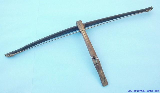 We offer for sale this small but well made wooden crossbow coming from Indo-China, probably from Vietnam, mid 20th C. or so. 27 inches wide, 11 ½ inches lon with a sring made of Bamboo, and Aluminum trigger. Very good condition.