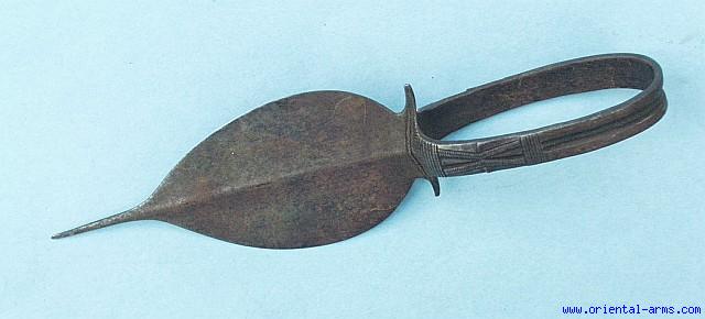 A loop dagger of the TIV people residing on the Niger river in Nigeria. Very typical but unusual whole still construction with the ring hilt forged in one piece with the blade. Leaf shaped 5 ½ inches long, 2 ½ inches wide blade ending with an acute tip. Flat hollow ground cross section with a central rib. Filed and chiseled ring handle 9 inches total length. Very good condition. Quite unusual and very elegant piece. |